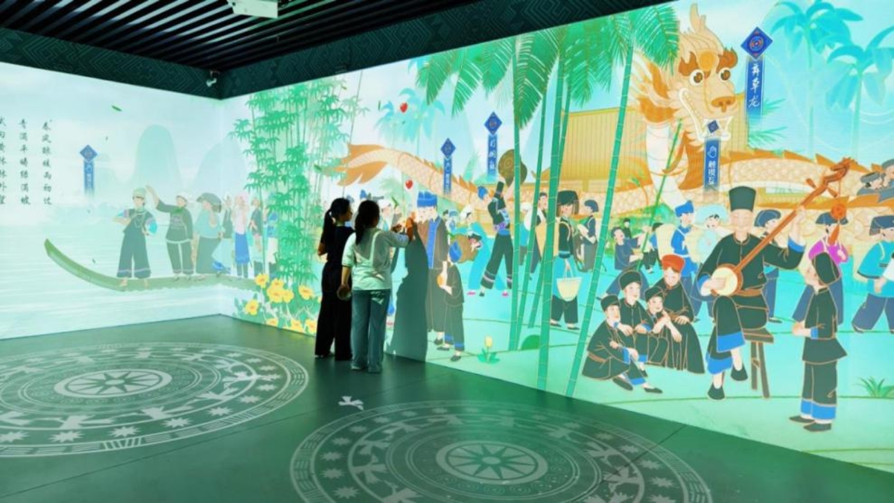 “穿越”歌圩场景。“廖江竹枝词”沉溺式互动空间使用MR技能、多模态感知和光粒级3D动态烘托,打造出真假交融的沉溺式互动空间。读者触碰感应点,便可在光影声电的交错中瞬间置身原生态歌圩的热烈场景,感触晚清诗人韦丰华笔下 “三月三”风俗图卷。此外,展厅融入了VR、点触、体感感应等多种技能,让阅读成为“随时随地、因你而动”的文明体会。
