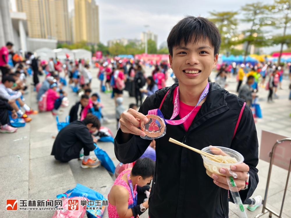 当天上午9点,第一批跑者冲过终点线,赛后美食区顿时变成露天餐厅。戴着奖牌的跑友们还未擦干汗水,便迫不及待加入排队行列。来自广东茂名的跑友在等待间隙和记者说:“赛前做攻略就知道玉林牛腩粉有名,完赛后来吃上一碗,既补充体力又满足味蕾,太治愈了。”