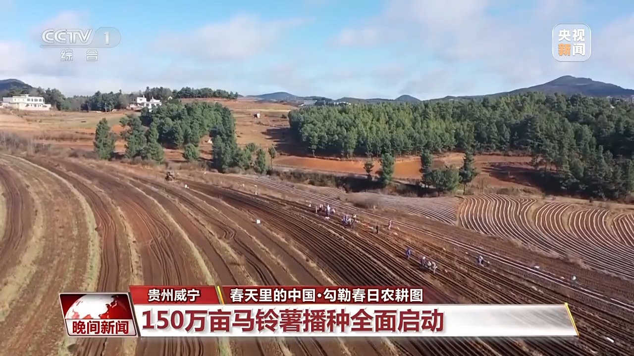 在贵州省威宁县的马铃薯栽培基地里,两台旋耕机正在开打开沟起垄作业。60余名栽培人员正忙着撒种、上肥、盖膜、覆土,田间地头一派繁忙现象。据了解,贵州省威宁县是全国马铃薯栽培培育面积超百万亩的工业大县之一。本年,全县马铃薯的栽培培育面积稳定在150万亩,总产量将打破300万吨,估计3月中下旬全面完成耕种。